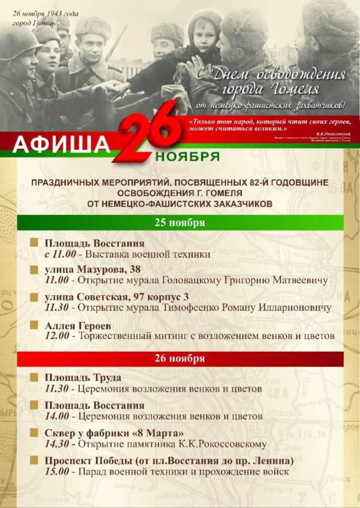 26 ноября 2025 года Гомель отметит 82-ю годовщину освобождения города от немецко-фашистских захватчиков.